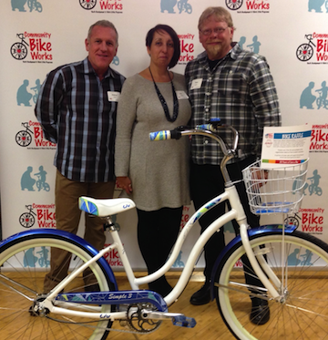 I attended the Community Bike Works fundraising event last night at Iron Pigs Stadium and the first people I met were Steve and the lovely Kim LaBrake. Community Bike Works of Allentown develops literacy, accountability and leadership of disadvantaged kids through their build a bike program. Steve has been on the board of Community Bike Works for 10 years donating time and collecting used bikes and parts for the program. Steve and Kim donated this awesome cruiser for the auction, I am sure it's not there first. Steve told me Kim is on the board of the March of Dimes, really great people we are lucky to have them as part of our community.