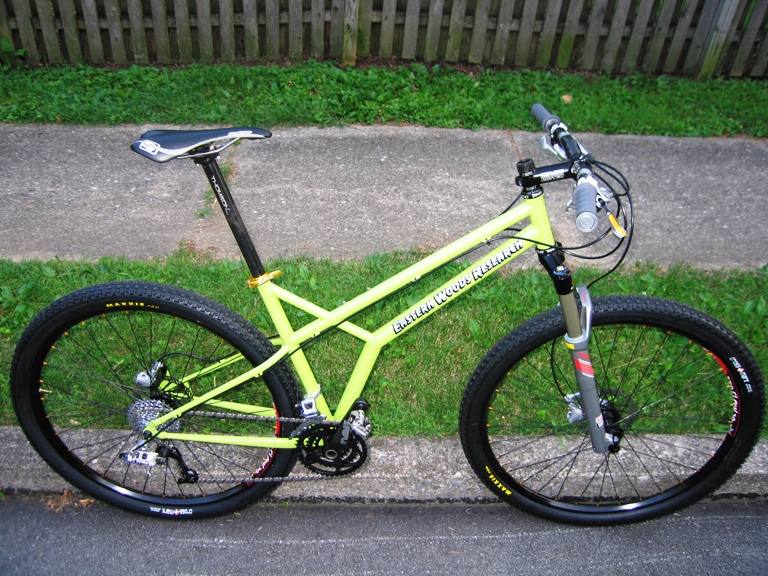 Welcome to our pre-launch of the OWB29er. All of us at EWR Bikes are proud and super-stoked to be sending this out to you for a sneak peak. What you see here is our hot new, mint as money OWB29er! The goal was to mimic the handling and heritage of the 26" OWB (Original Woods Bike) on a 29" wheeled platform, and the result is even better that I expected. Tonight was our first shakedown ride and pre-race break-in. We, as well as many of you, have been waiting with such anticipation -- here is what I've found out: